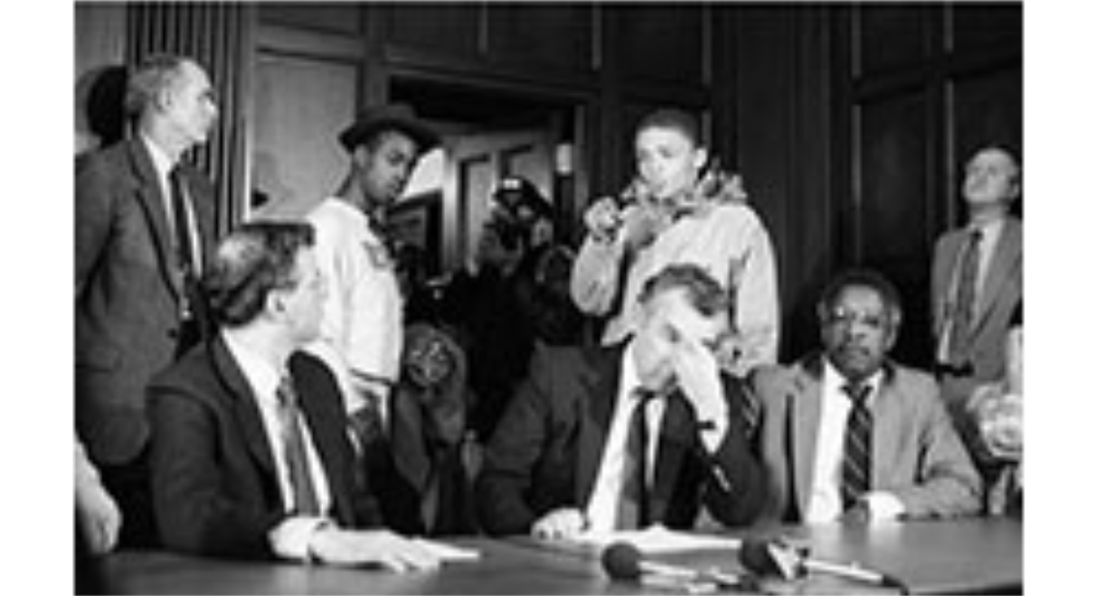 Paul Brown Sr. and Harold Shapiro are confronted by BAM III activists, 1987. From the Ann Arbor District Library archives, hosted by the University of Michigan Library.